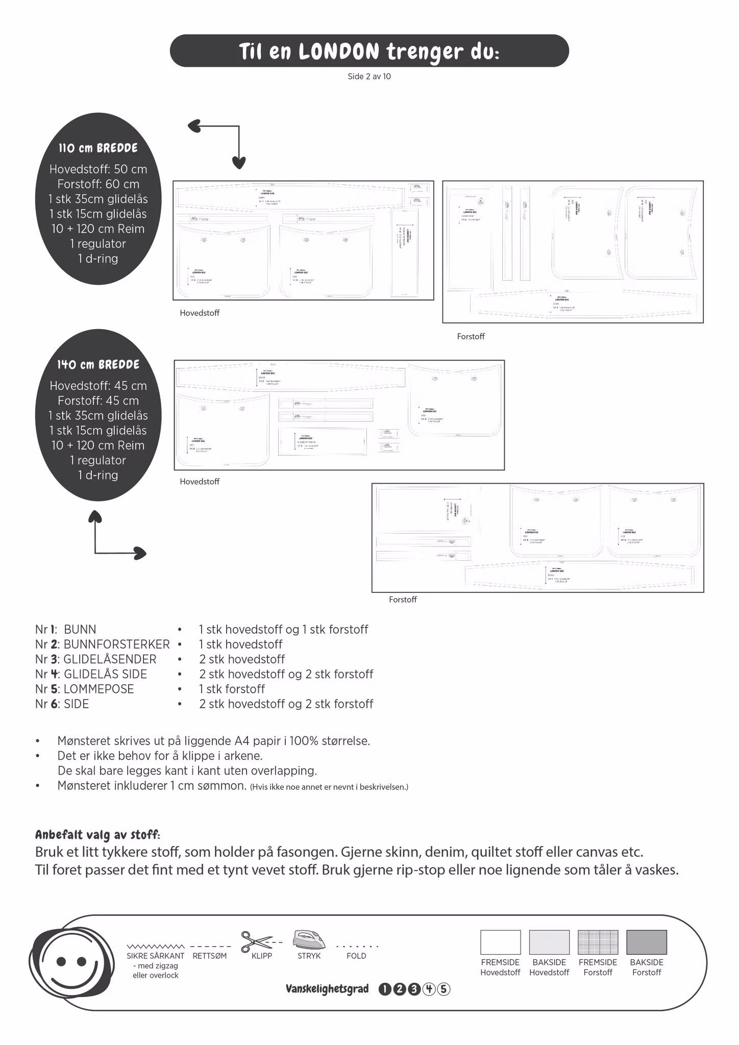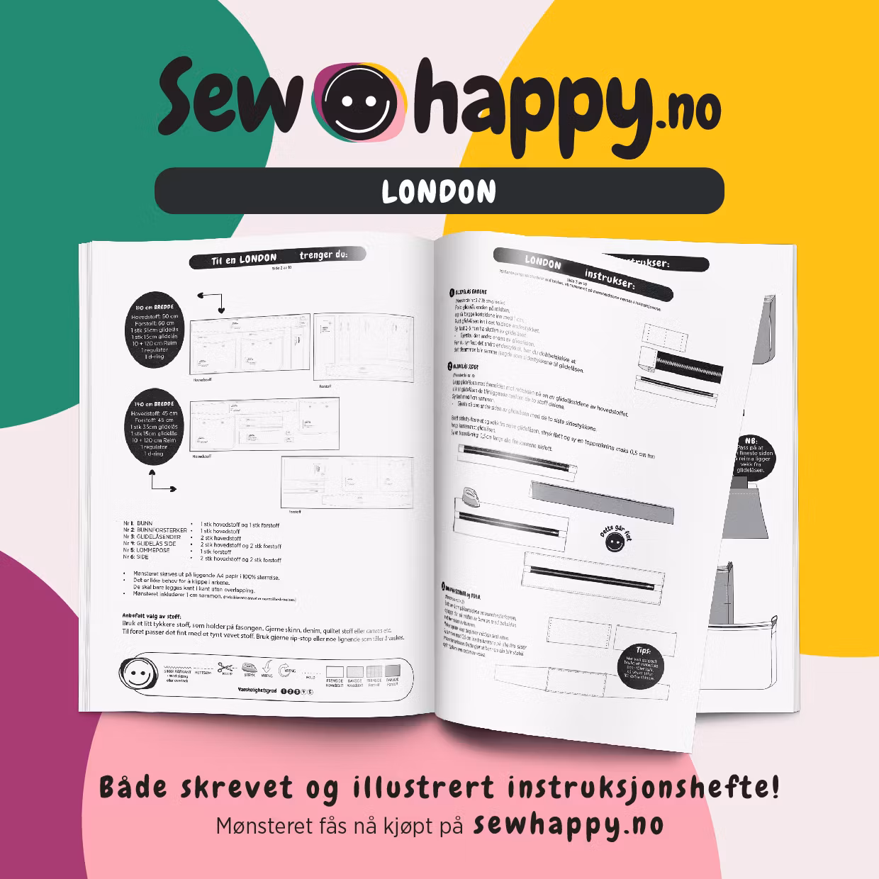 SewHappy LONDON er en foret crossbody veske med glidelås lukning i toppen. Den kan også bæres over skulderen, for reimen kan reguleres i lengden. Den har en lomme med glidelås på innsiden og forsterket bunn på utsiden. Vesken er ekstra romslig for å kunne få plass til alt man trenger når man for eksempel skal til London :-) Perfekt til shoppingturer, julebordet, som arbeids veske og andre utflukter. SewHappy LONDON egner seg best sydd i litt tykkere stoffer som dobbeltsidig quilt, skinn, tykkere kanvas og lignende. Man kan også bruke tynnere stoffer, om man vil at veska skal bli "mykere" i formen. Mønsteret er ikke for krevende, slik at nybegynnere fint kan mestre dette. Men samtidig såpass avansert at de som har litt mer erfaring ikke vil kjede seg :-)