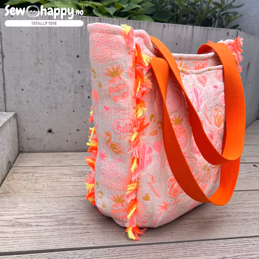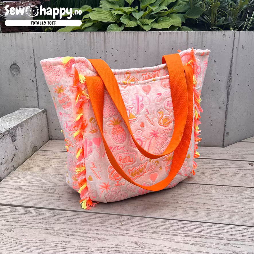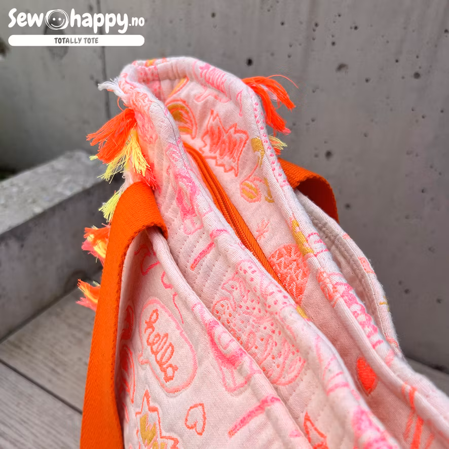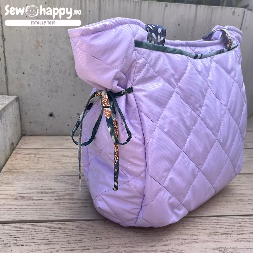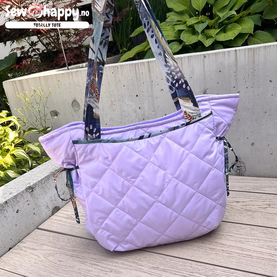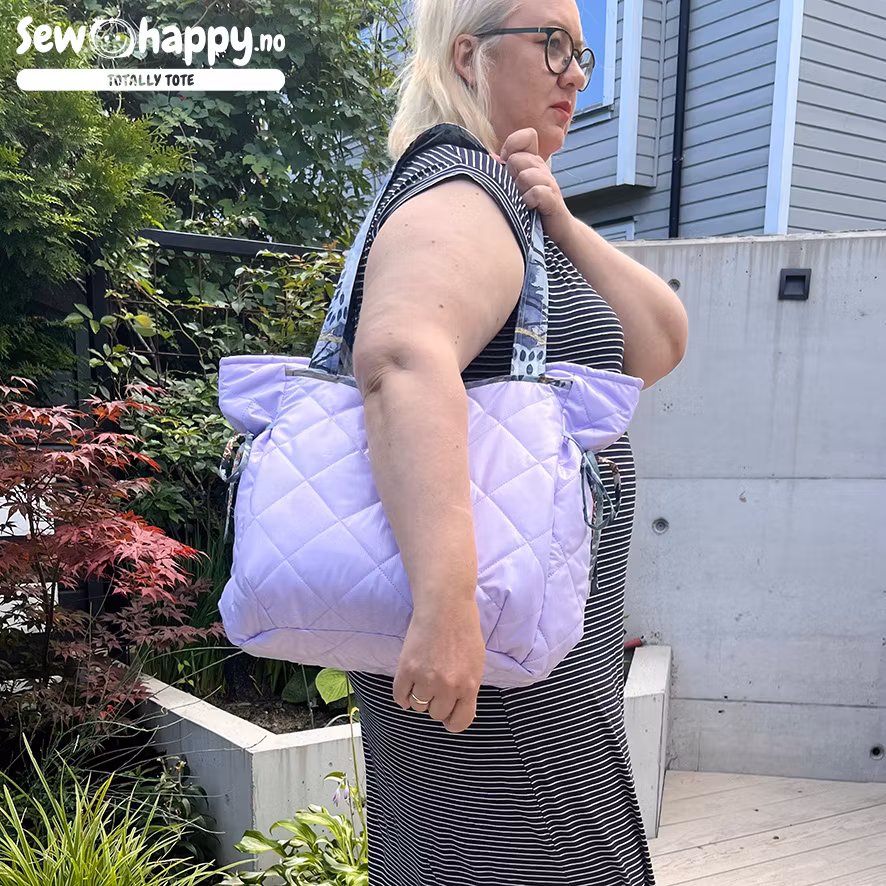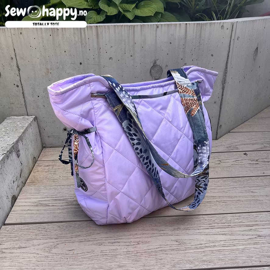 SewHappy TOTALLY TOTE er en foret veske (Tote) med glidelås lukning i toppen. Den har lommer både på innsiden og på utsiden. Her får du plass til det meste :-) Den ovale bunnen gjør vesken ekstra romslig. Perfekt til handleturen, badetøy, trening, barnehagen og andre utflukter. SewHappy TOTALLY TOTE egner seg best sydd i litt tykkere stoffer som dobbeltsidig quilt, pledd, tykkere kanvas og lignende. Mønsteret er ikke for krevende, slik at nybegynnere kan mestre dette. Men samtidig såpass avansert at de som har litt mer erfaring ikke vil kjede seg :-)